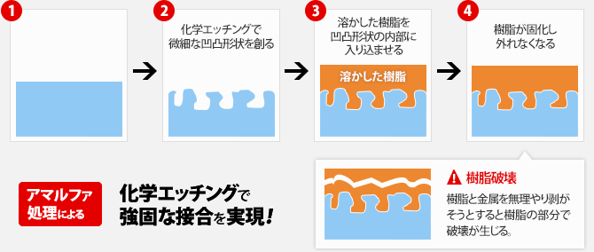 AMALPHA/アマルファは樹脂と金属を直接接合させるための当社独自の金属表面処理技術です。