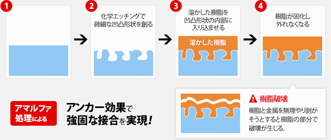 アマルファは、金属表面の微細凹凸内部に樹脂が入り込んで固まることによるアンカー効果によって接合します。