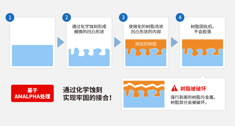 AMALPHA是我公司独自研发的直接接合金属和树脂的金属表面处理技术。通过在树脂与金属的界面上相互接合,制造出树脂与金属一体成型的部件。